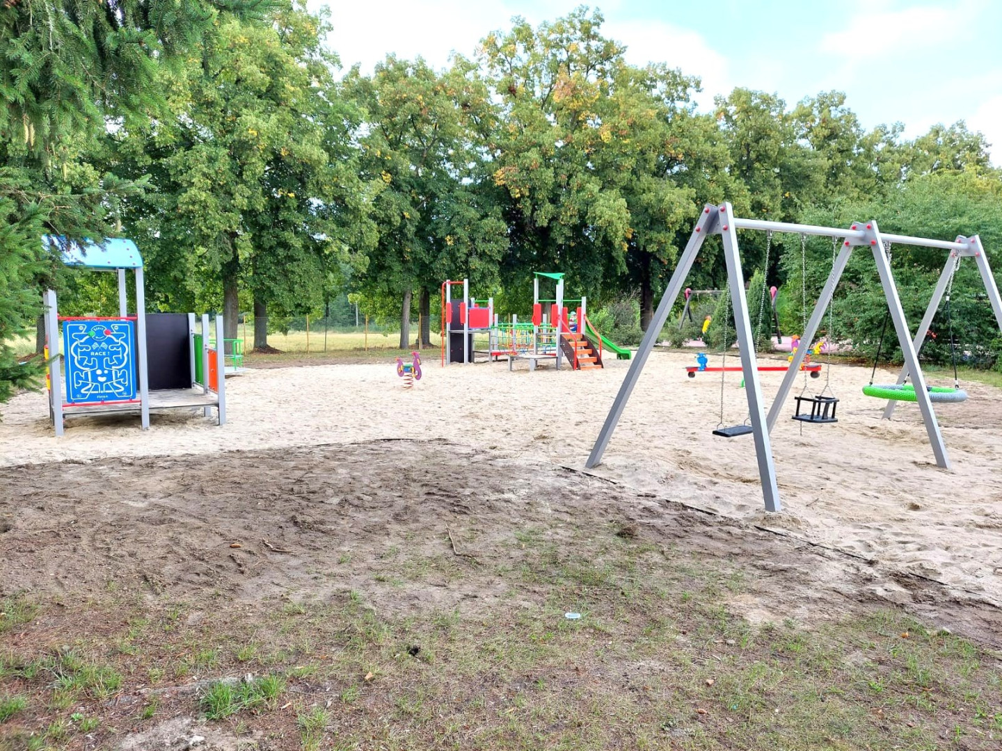 - zestaw zabawowy dla starszaków (min. 1 zjeżdżalnia, min. 1 część poprawiająca koordynację ruchów oraz utrzymywanie równowagi dziecka np. most zwodzony)